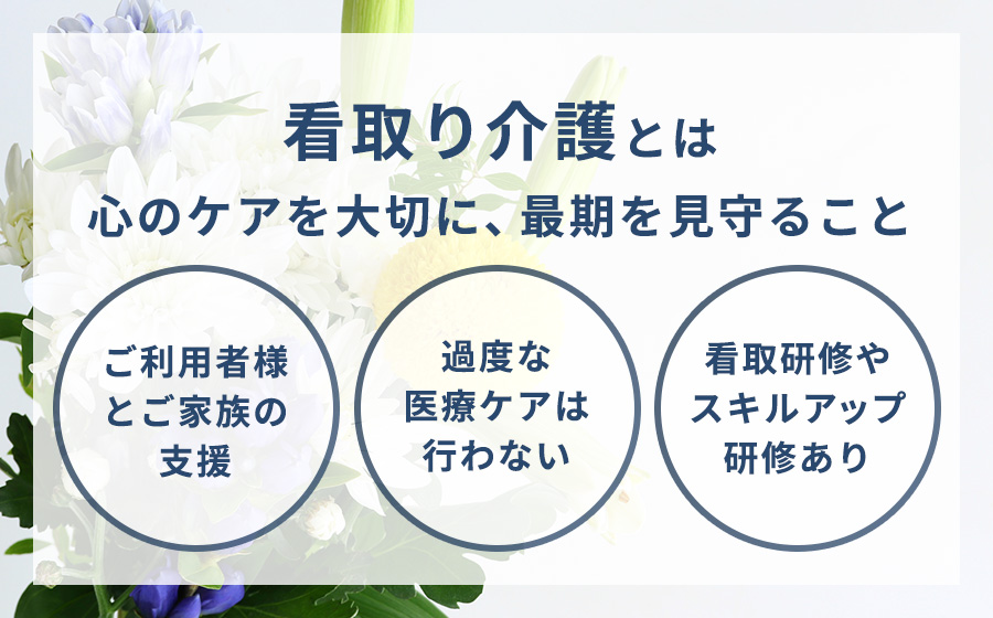 看取りとは、近い将来、死が避けられないとされた人に対し、身体的苦痛や精神的苦痛を緩和・軽減するとともに、人生の最期まで尊厳ある生活を支援すること
